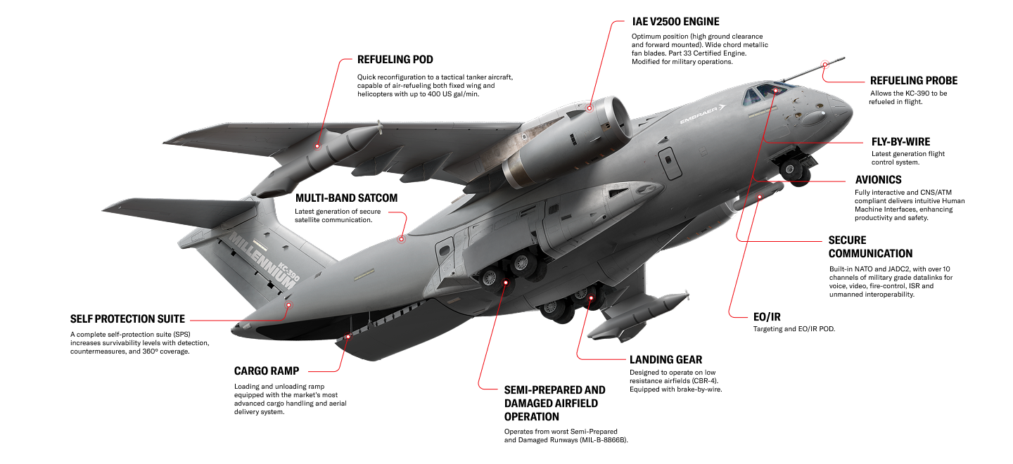 The KC-390 MILLENNIUM aircraft is a highly flexible platform that combines multi-mission capabilities with the lowest life cycle cost in the tactical airlift market. Due to its versatility, flexible design and multi-mission capability, a fewer number of KC-390 are required to perform different missions.