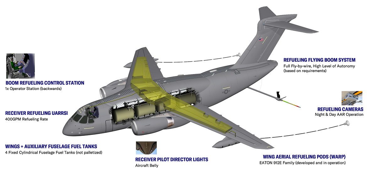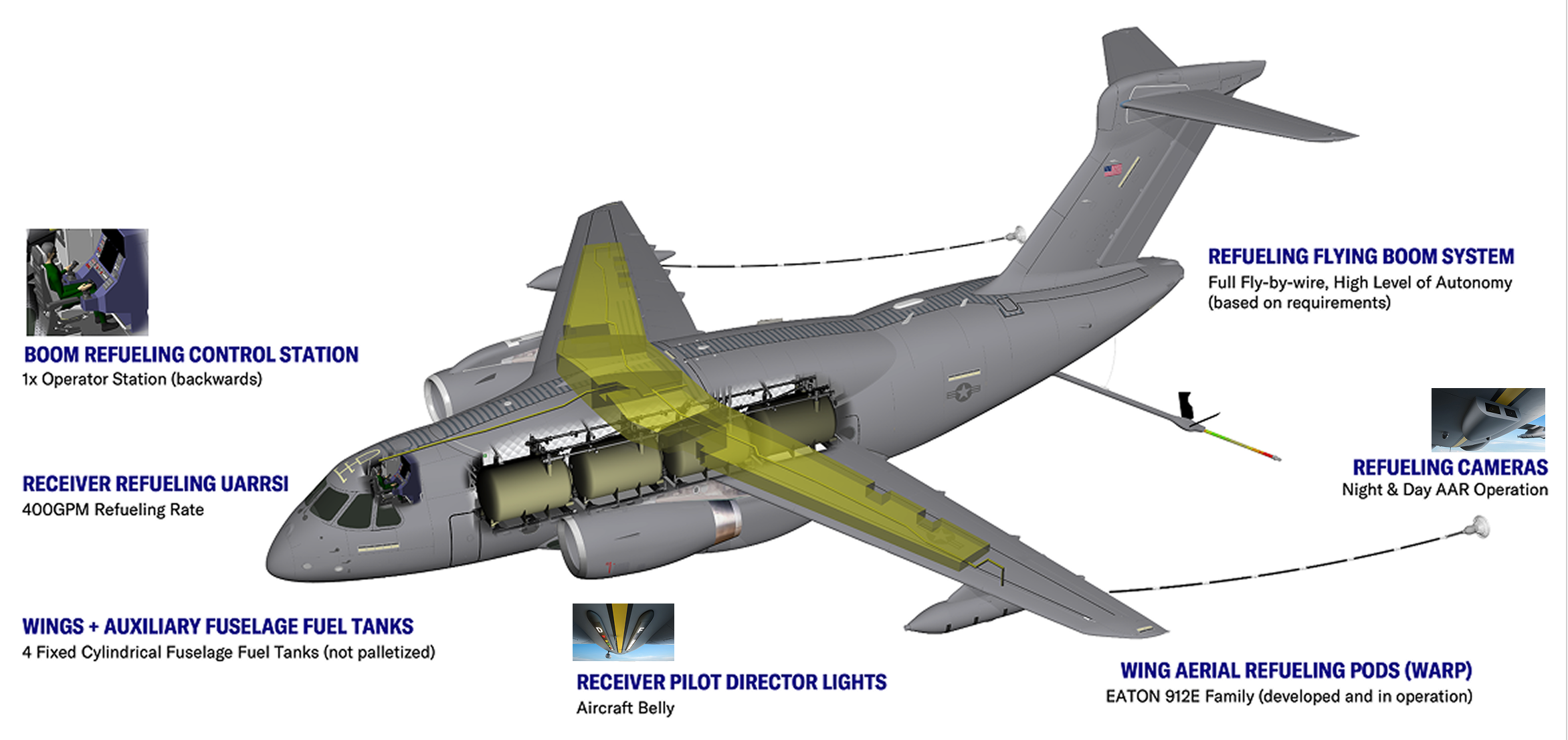 - Up to 3x Roll-on/Roll-off Fuselage Fuel Tanks – 8,800 lbs. of fuel in each tank